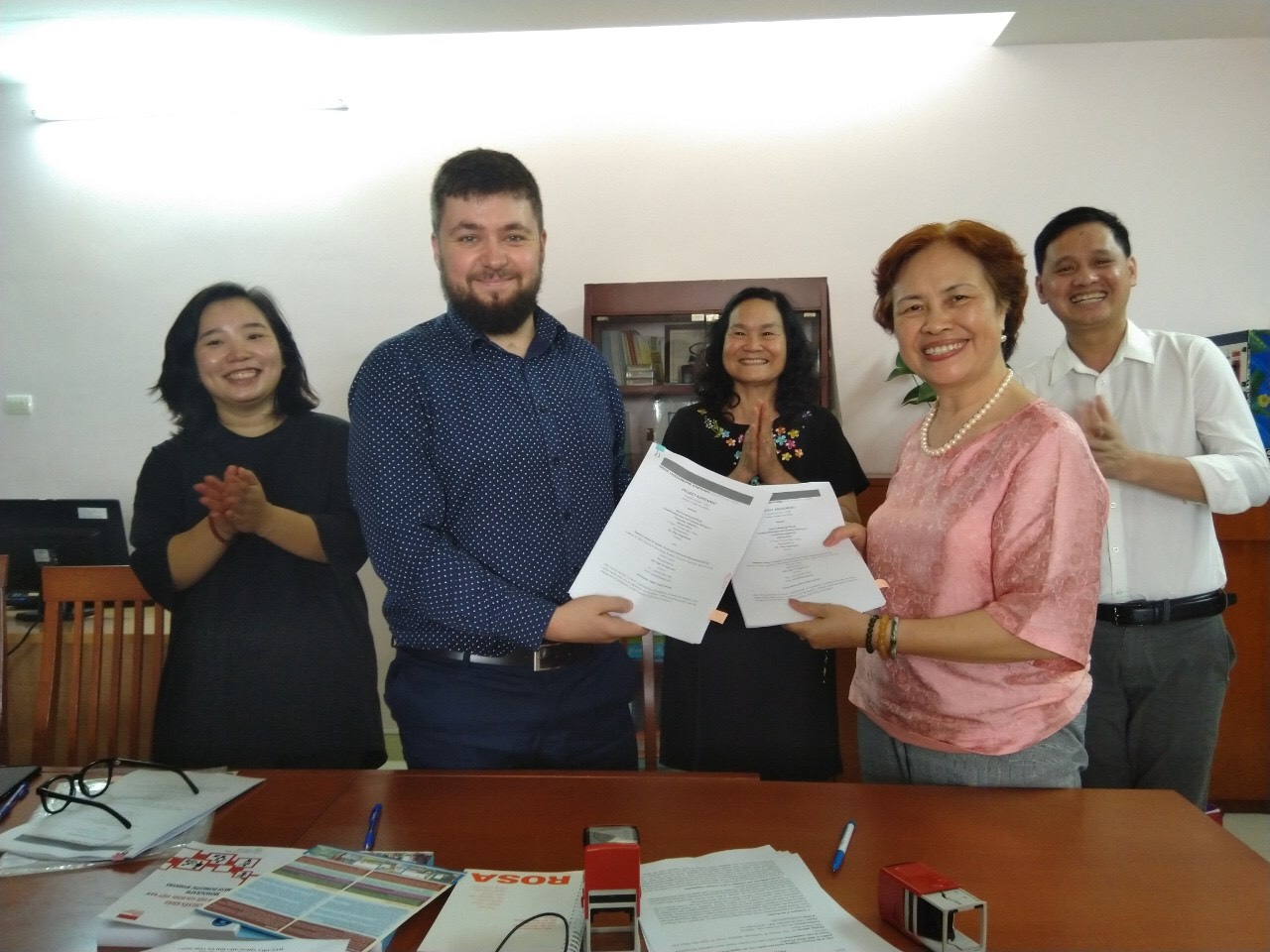 Ảnh: Giám đốc Ngô Thị Ngọc Anh (GFCD) và Giám đốc quỹ Rosa Luxemburg Stiftung Southeast Asia ký kết thỏa thuận hợp đồng dự án năm 2019.