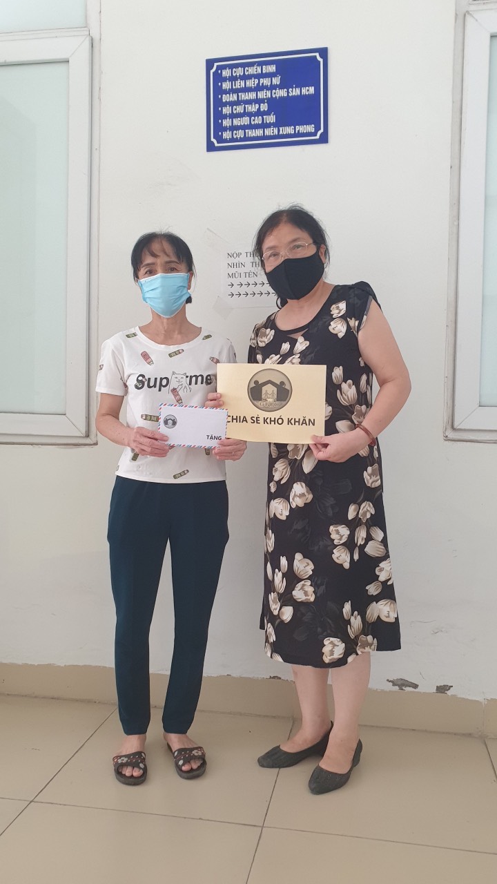 Ảnh 3: Đại diện Ban chủ nhiệm phường Nhân Chính quận Thanh Xuân trao quà hỗ trợ cho thành viên có hòa cảnh khó khăn.